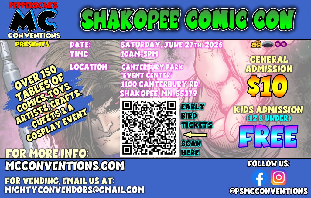 We are bringing Prime Comic Dealers, Toy/TCG Vendors, Artists, Crafters, Guests, and A Cosplay Event (Cash Prize) to Shakopee, MN!